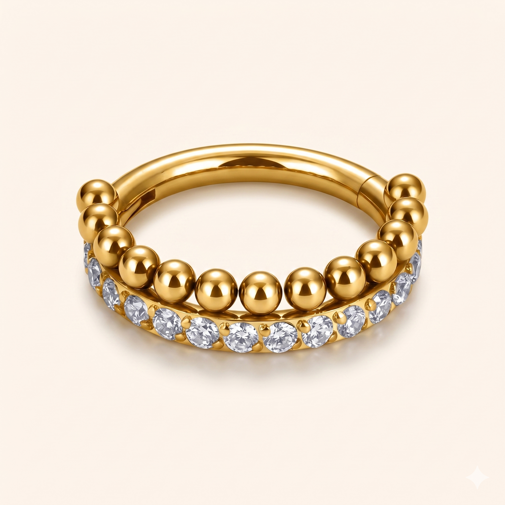 Rząd diamentów otaczających ucho — ten tytanowy pierścionek zatrzaskowy G23 jest ozdobiony linią precyzyjnie dopasowanych cyrkonii CZ, tworząc dramatyczny efekt biżuterii. Od muszli po daith, przekształca każdy piercing w luksusową biżuterię.