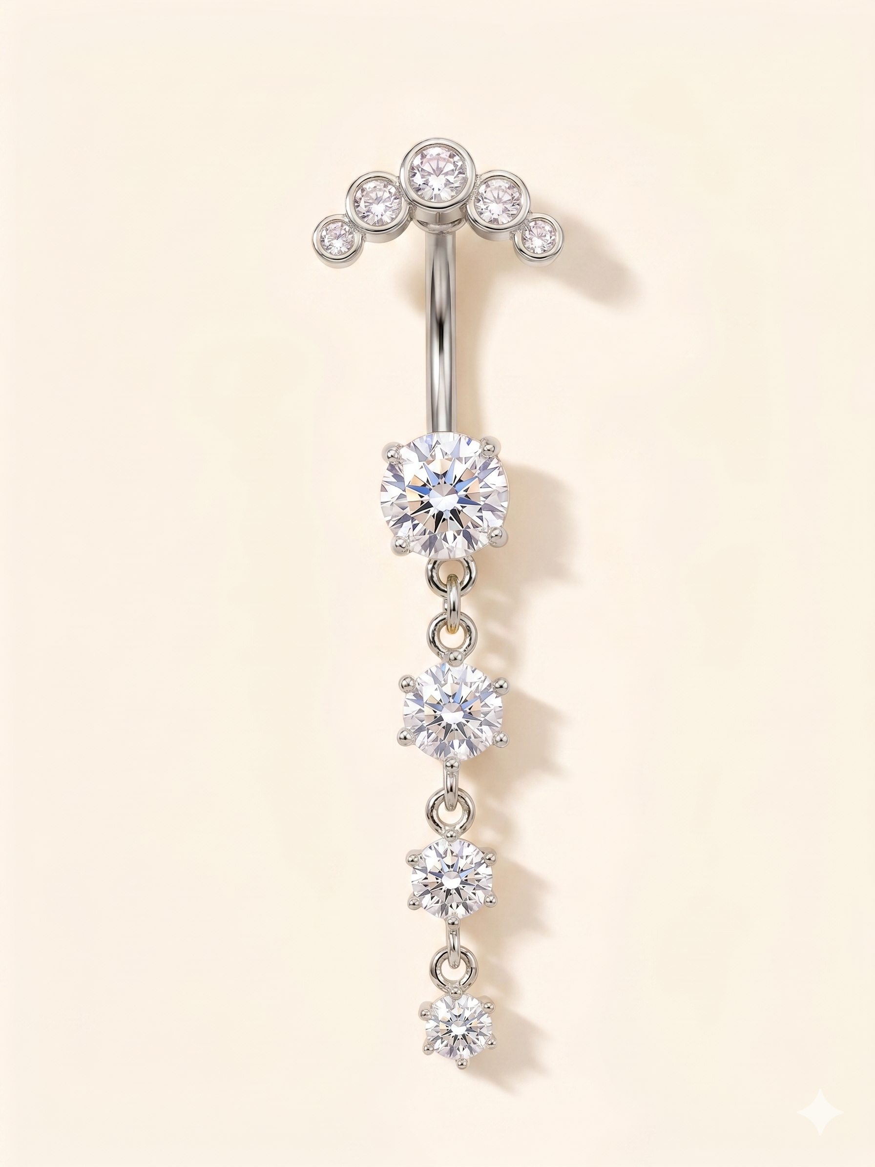 Delikatność kwiatu, solidność stali. Ten wiszący piercing do pępka łączy w sobie rzeźbione płatki i cyrkonie, tworząc cenny, codzienny efekt biżuterii.